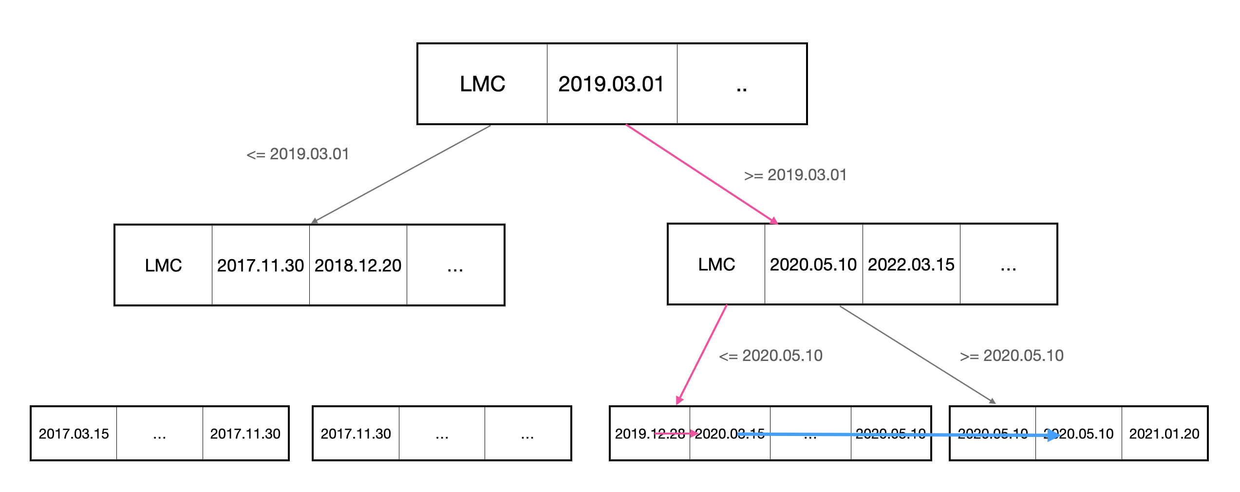 - 루트 노드에서 리프 노드까지 탐색하면서 2020년도의 가장 빠른 입사 일시 인덱스를 찾는다.(수직 탐색)