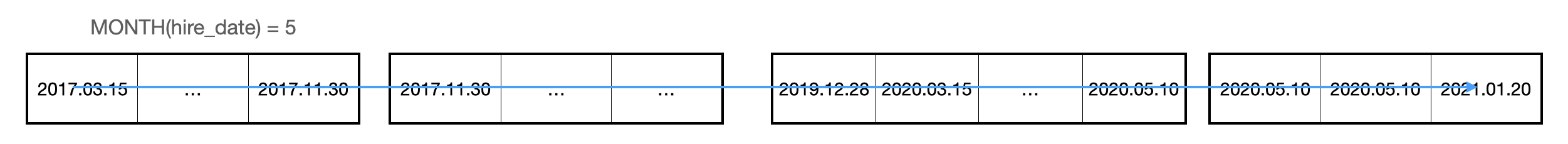 예를 들자면, Employee 테이블에 입사일시가 인덱스로 설정되어있고, 직원 중 2020년에 입사한 직원을 찾고 싶다.2020년도에 가장 빠른 입사일시를 찾는 과정은 아래와 같이 될 것이다.