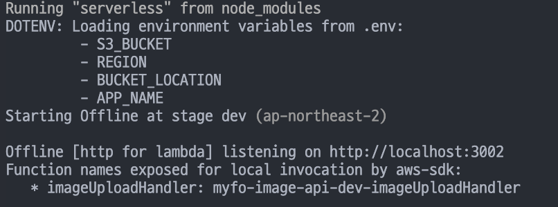 serverless offline start나 serverless deploy 명령어를 실행해보면 아래와 같이 환경변수가 주입되는 걸 확인할 수 있다.