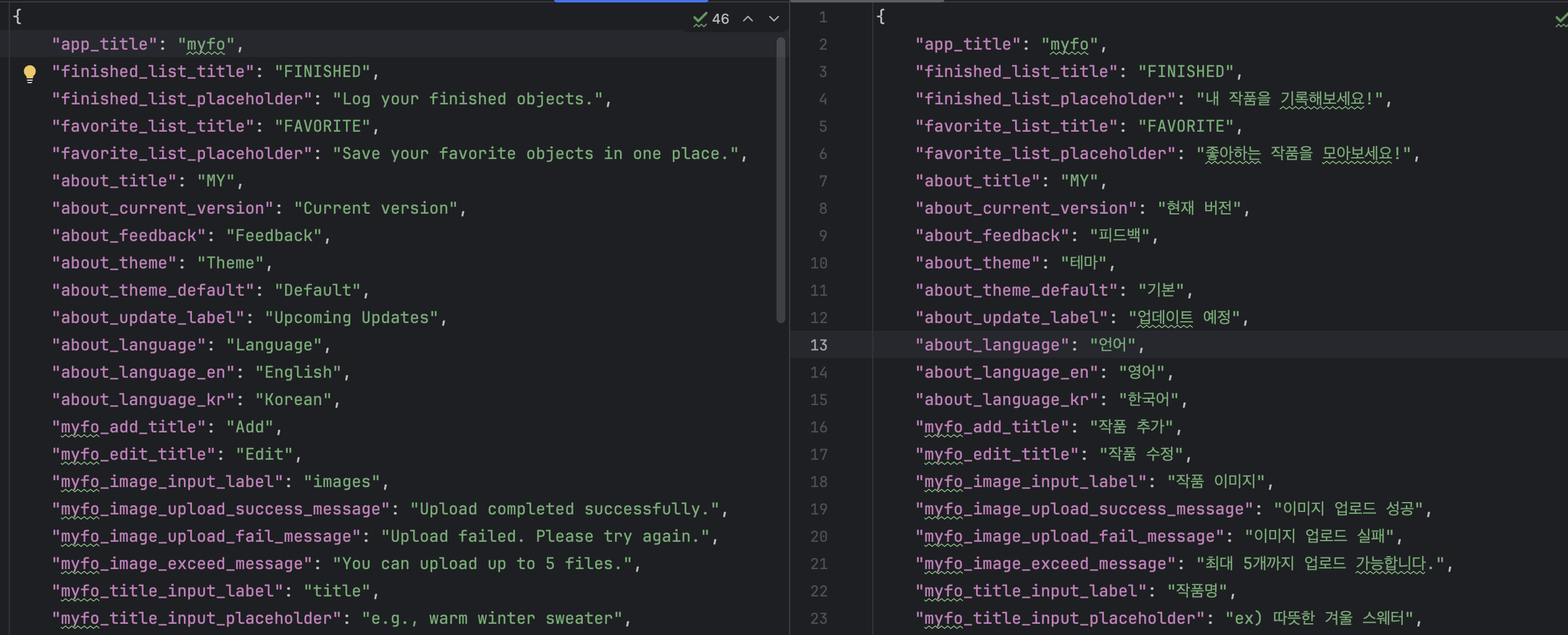 영문 버전은 app_en.arb에 작성하고, 한글버전은 app_ko.arb에 작성해주었다.(문구 이름은 같아야 한다)