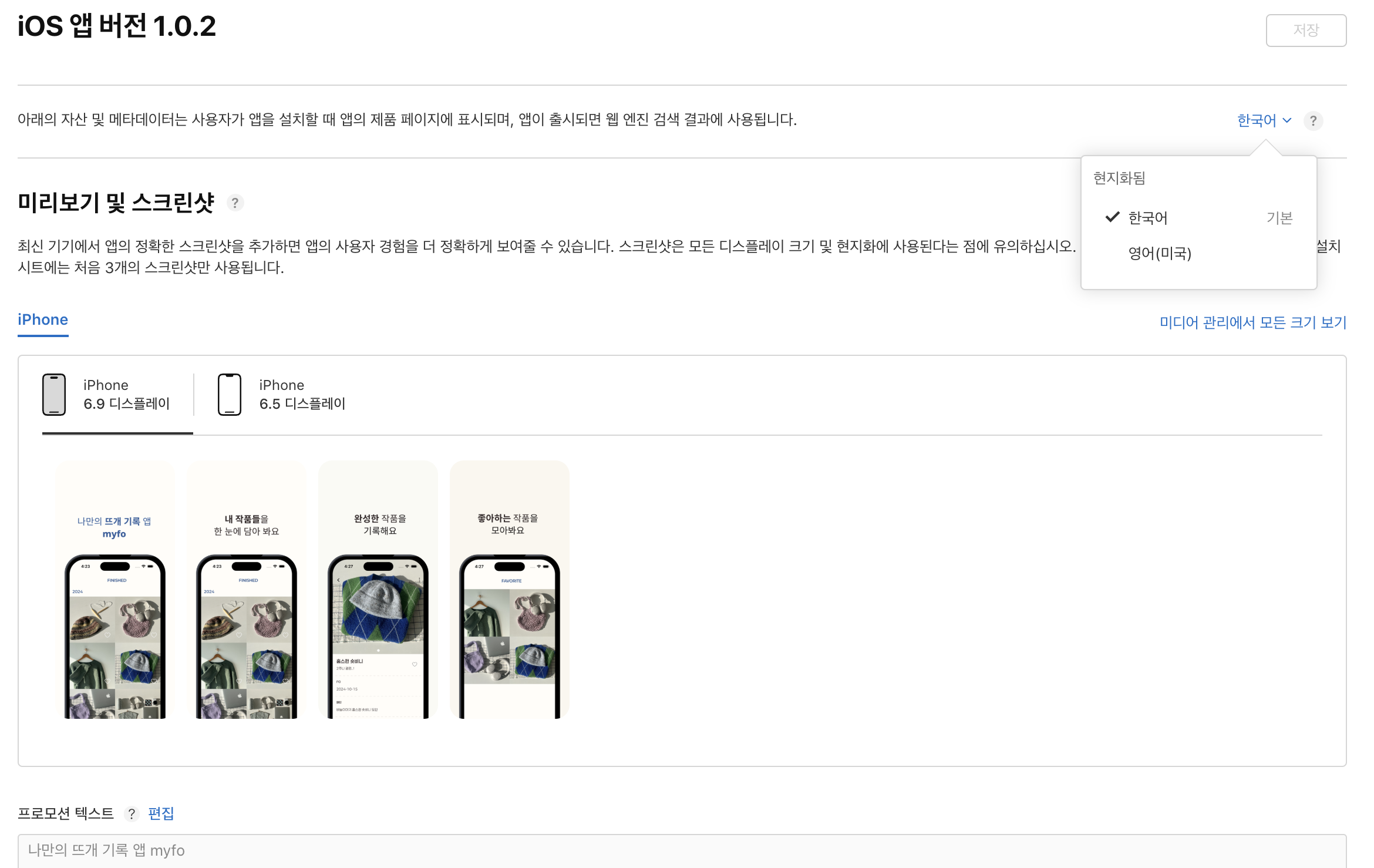 앱 스토어에서 언어별로 미리보기 이미지, 프로모션 텍스트, 설명 등을 설정할 수 있다.