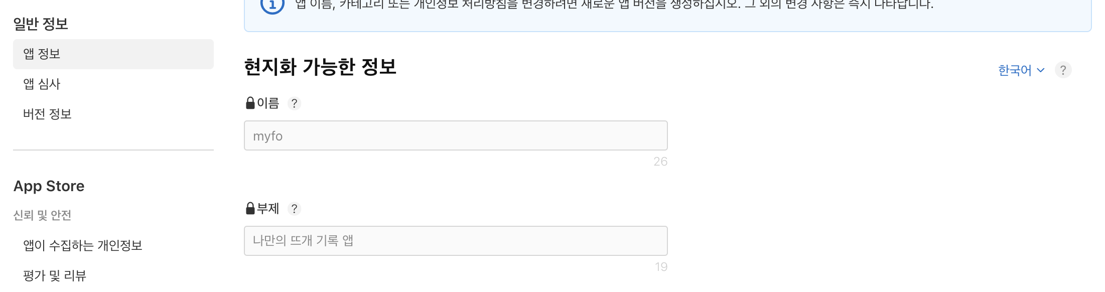 앱의 이름도 언어별로 다르게 설정할 수 있다. 만약 이름이 설정한 언어의 다른 앱과 겹친다면 부제를 달아서 수정해줄 수 있다.