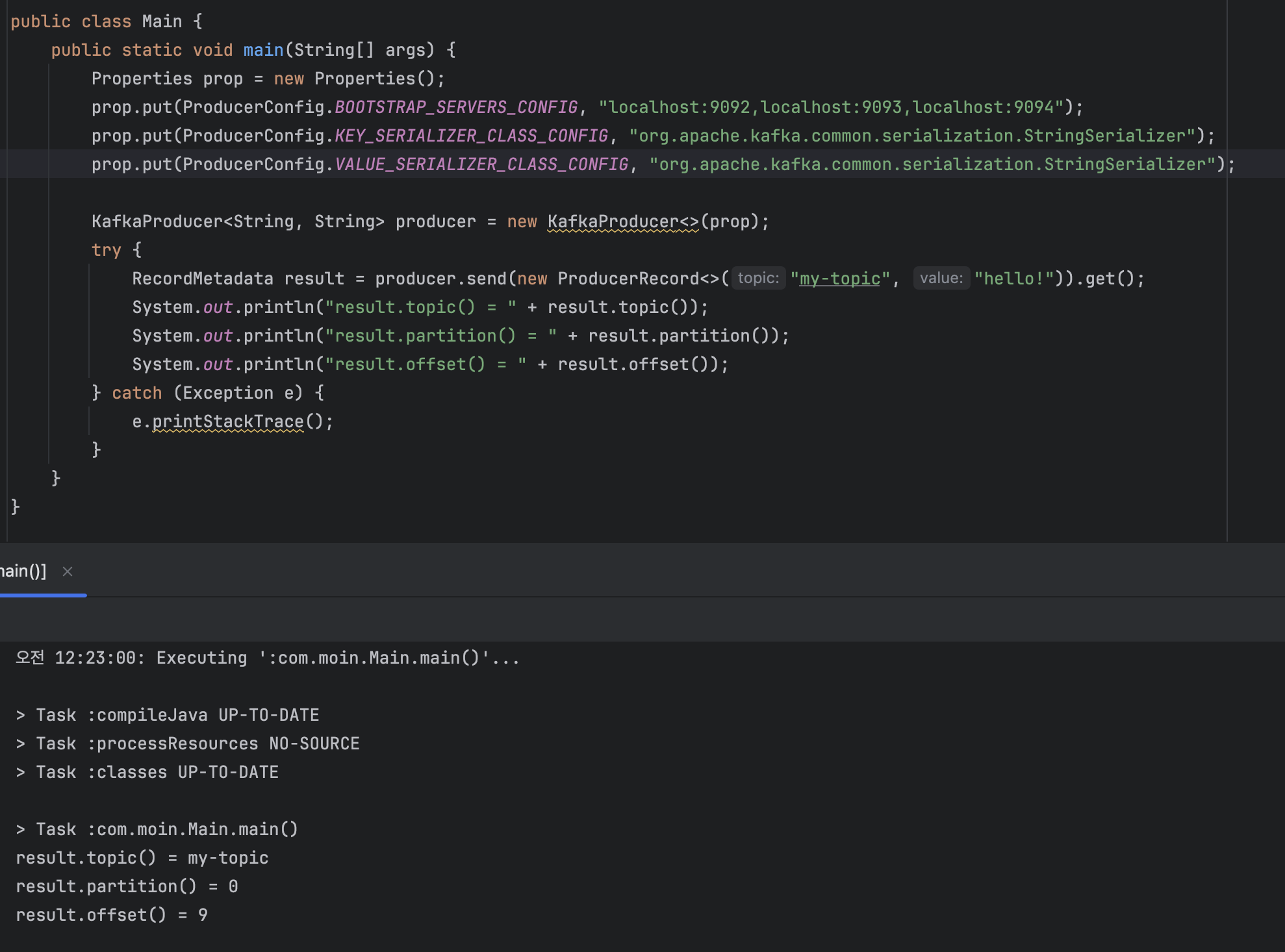 producer.send(new ProducerRecord<String, String>("topic1", "hello world"));