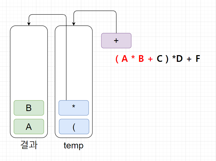 temp의 top인 *이 +보다 우선순위가 높으므로 pop한 뒤, 결과 벡터에 넣어준다.