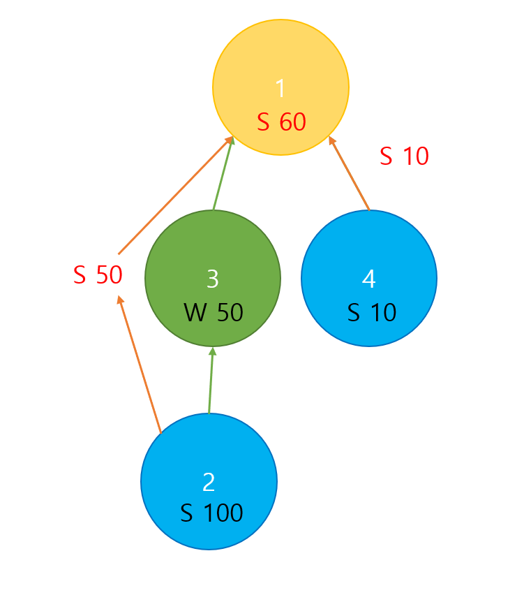 dfs로 리프 노드까지 갔다가 리프 노드 부터 다시 루트 노드로 올라올때 올라올 수 있는 양을 계산해 주었다.