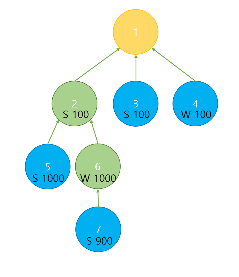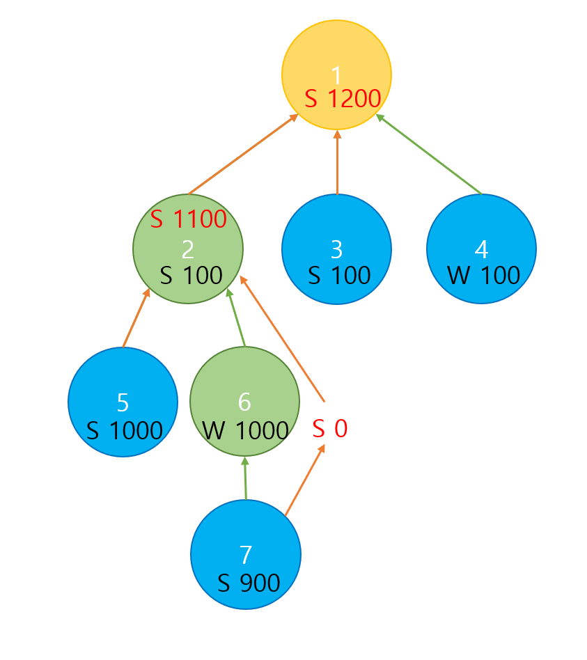 1. 7 -> 6 -> 2 -> 1 이 방법은 6번 섬에서 늑대가 양보다 많으므로 양이 모두 잡아먹혀서 양은 1번섬에 도착할 수 없다.( 0마리가 도착하는 것이다)