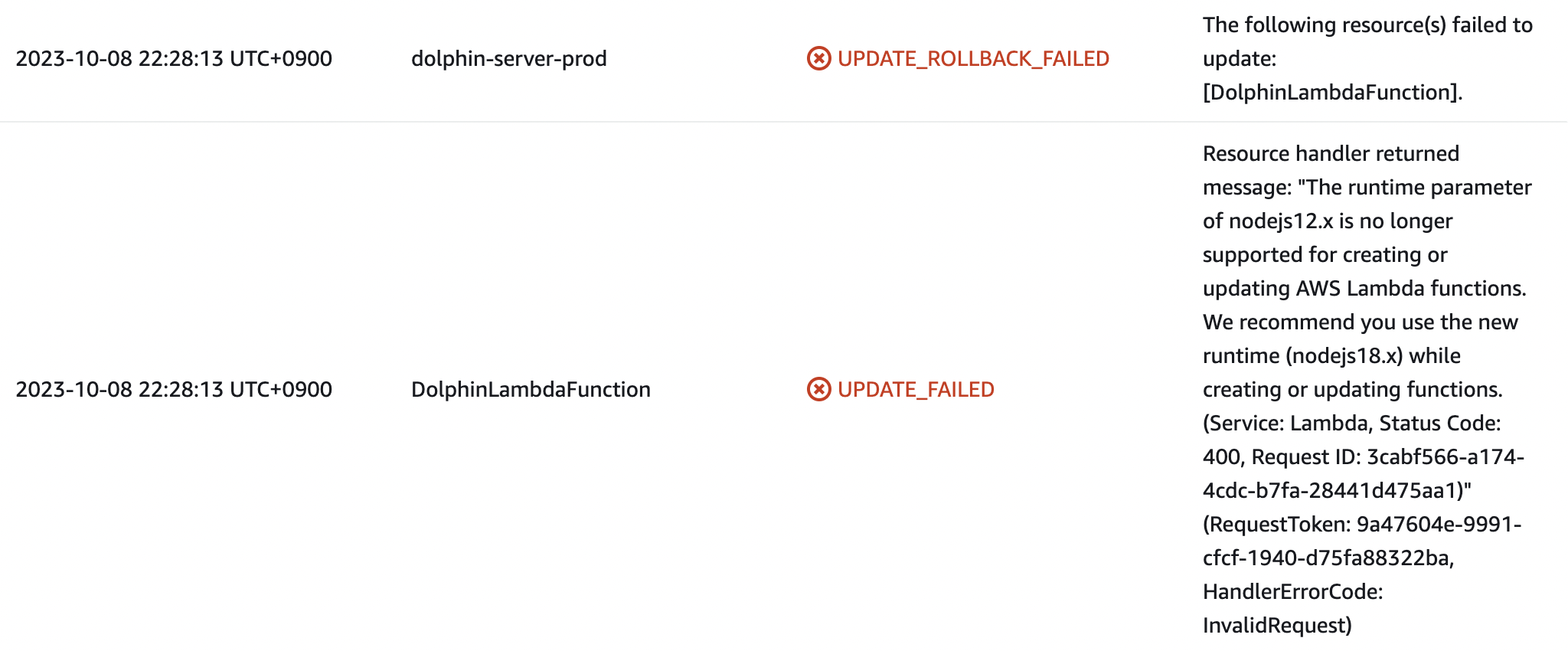 나의 경우에는 아래 UPDATE_FAILED에 있는 에러메시지 처럼 람다 실행환경이 이제 지원을 안하는 버전이라서(node12.x) 아예 상태 갱신조차 안되는 상태였다. 보통 serverless.yml 설정을 수정해서 다시 배포해주면 잘 되지만, 내 경우에는 이것저것 해본다고 콘솔로도 배포하고 해서 뭔가 잘 안됐던것 같다.