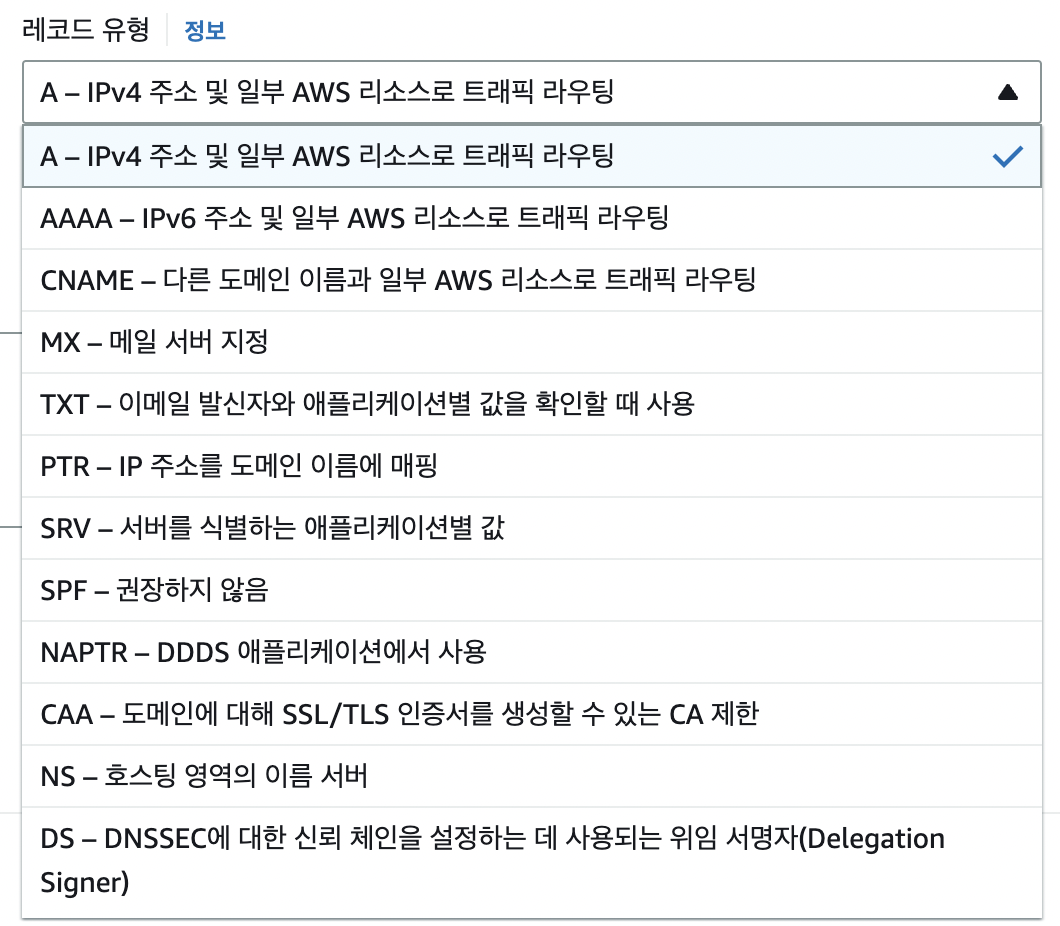 도메인을 구매하고 나면, Route53에 호스팅 영역을 생성한다. 호스팅 영역이란 DNS 관리를 할 수 있는건데 여기서 레코드란걸 만들 수 있다.
