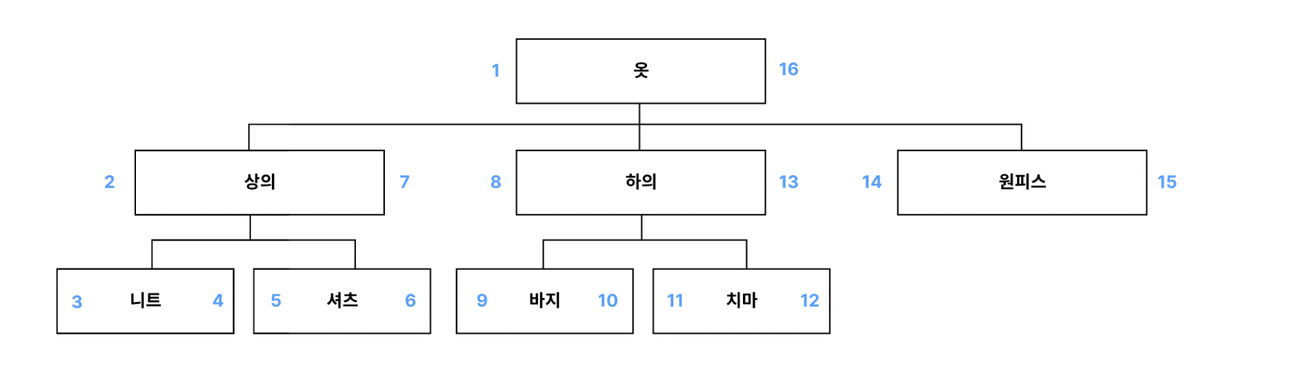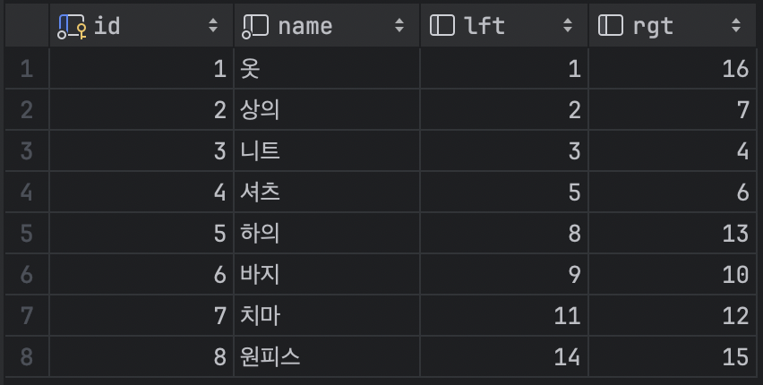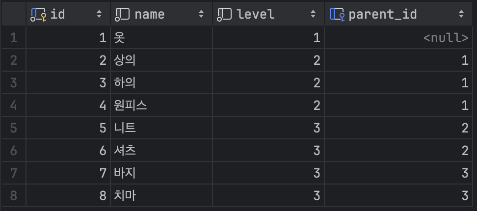 자식 노드인 니트는 상의의 id를 알고 있고, 상의는 부모 노드 옷의 id를 알고 있다.
