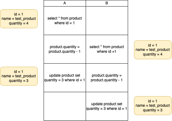 A와 B가 모두 재고를 차감했으니 재고는 -2해서 quantity가 2가 되어야 하지만, 실제로 결과는 3이 된다.