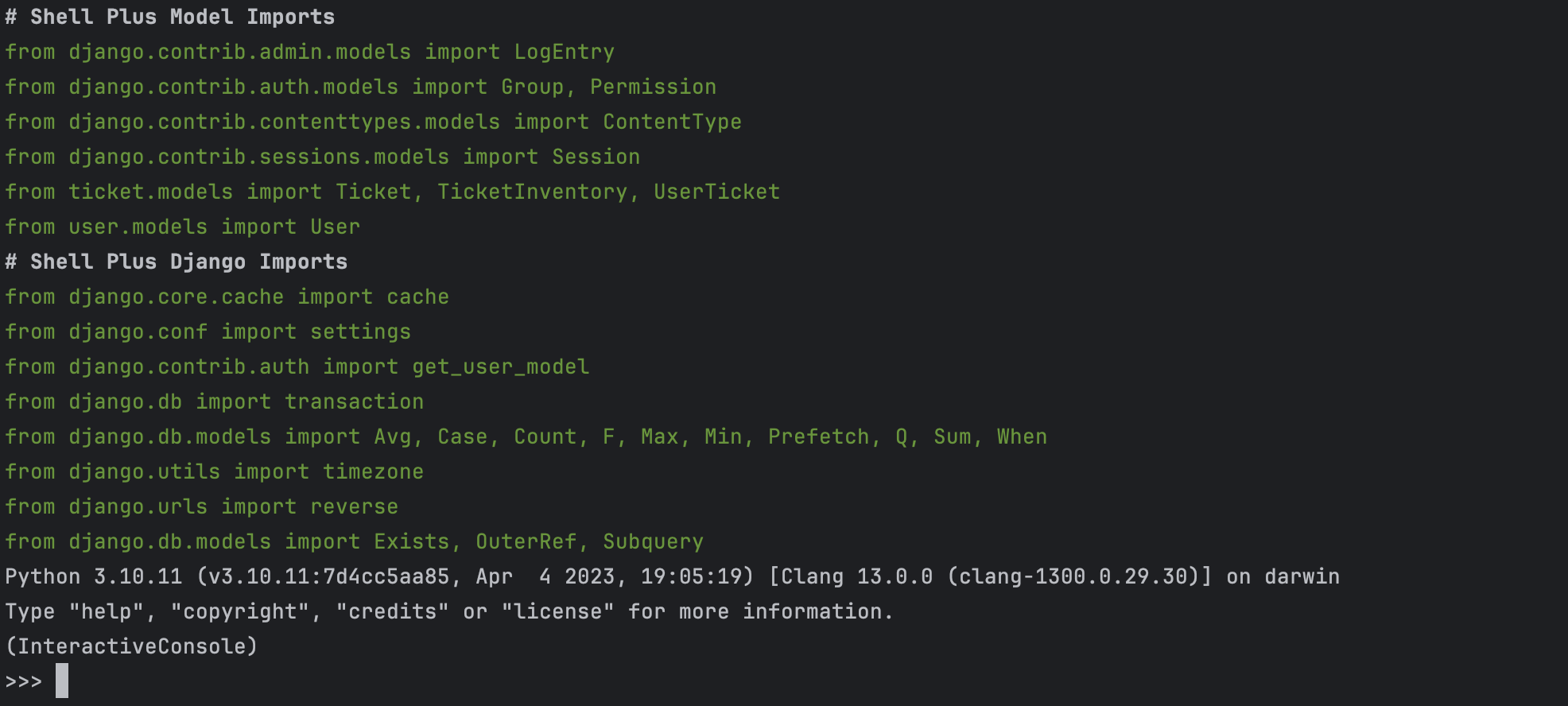 개발자가 정의한 모델과 Django에서 사용하는 여러가지 함수, 객체들을 미리 import 해주는 걸 확인할 수 있다.